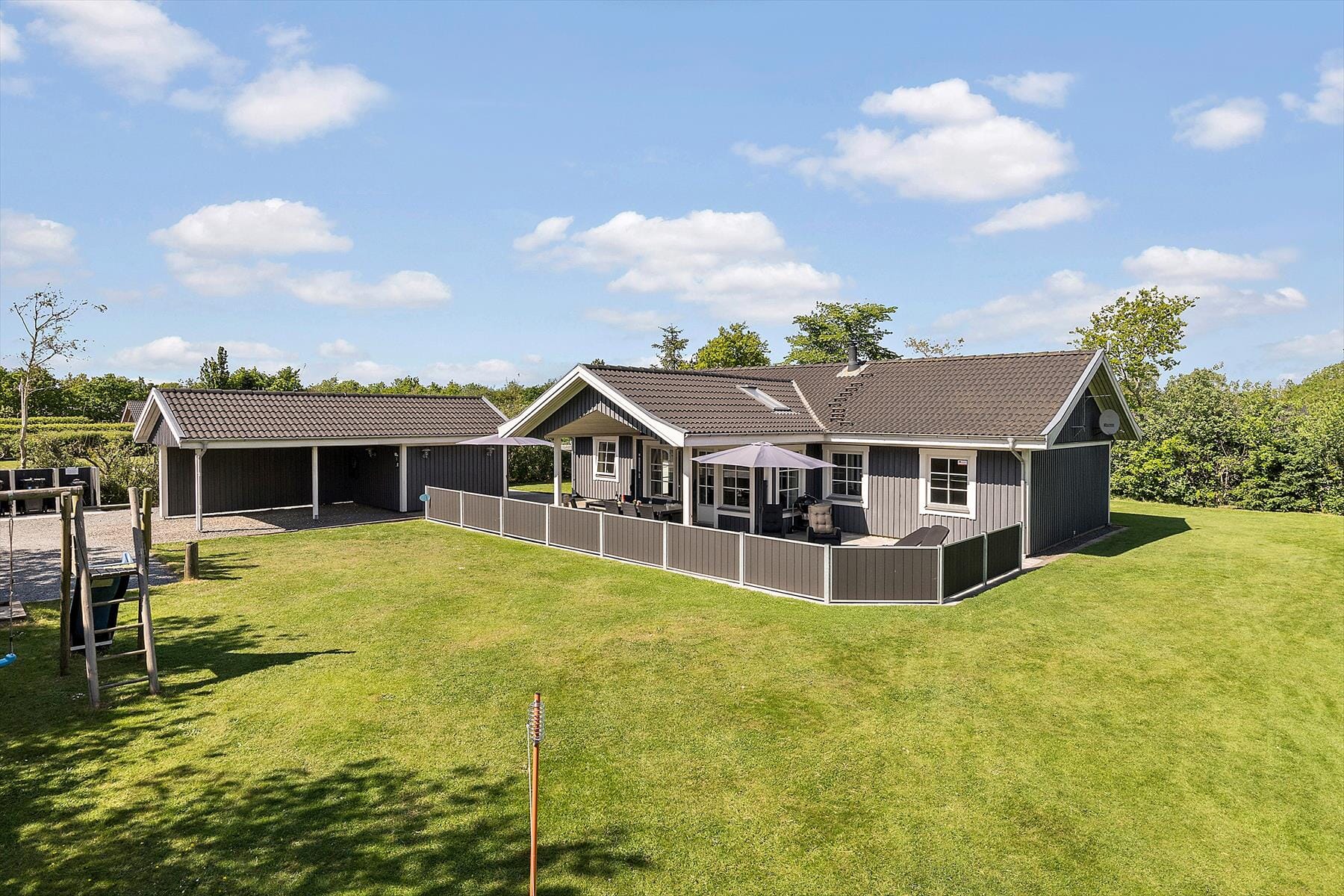 Boligen er på 126 m² og ligger på en 1 200 m² stor eiendom, med blant annet huske og sandkasse.