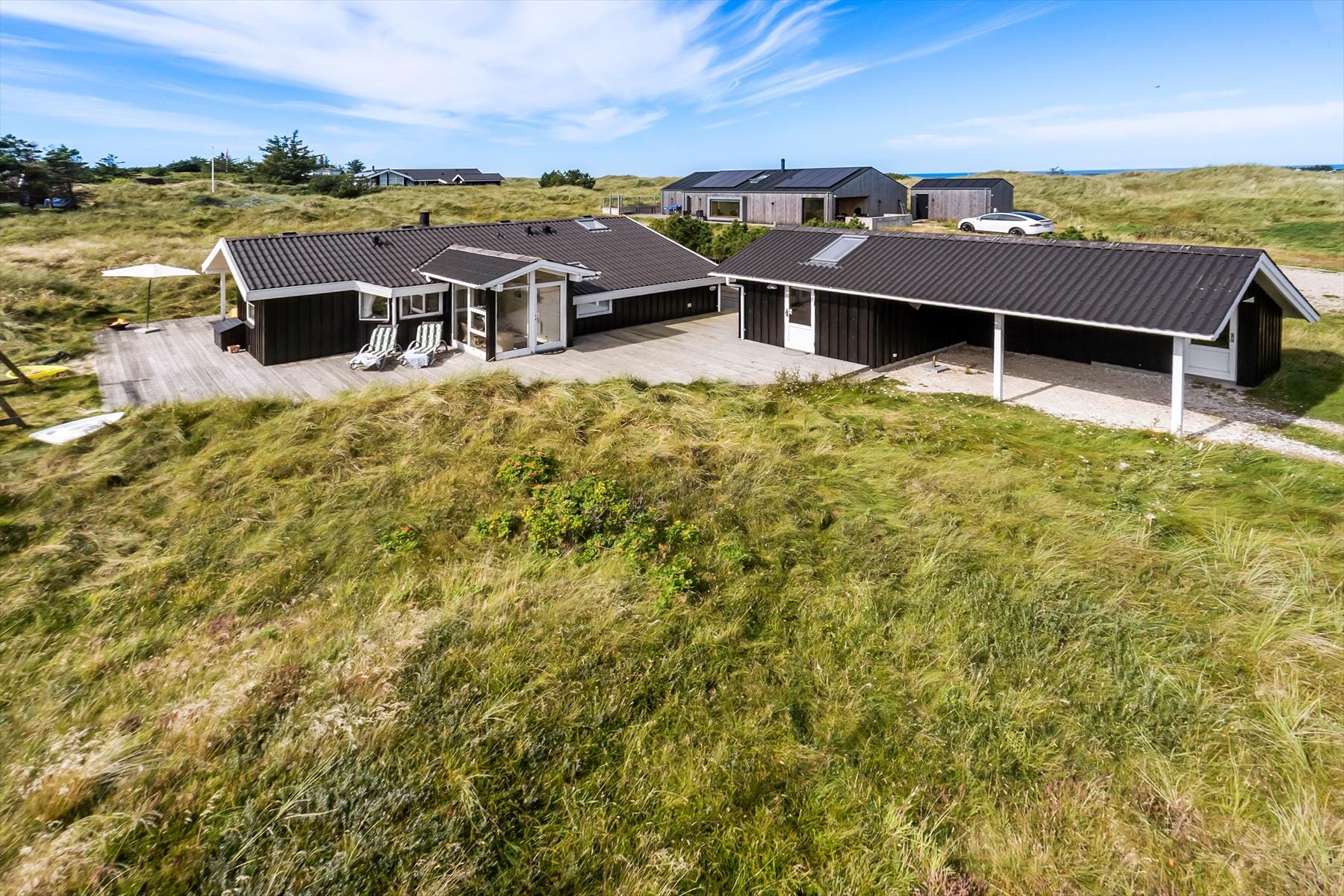 Boligen er på 98 m² og ligger på en 2 790 m² stor eiendom, med blant annet huske og sandkasse.