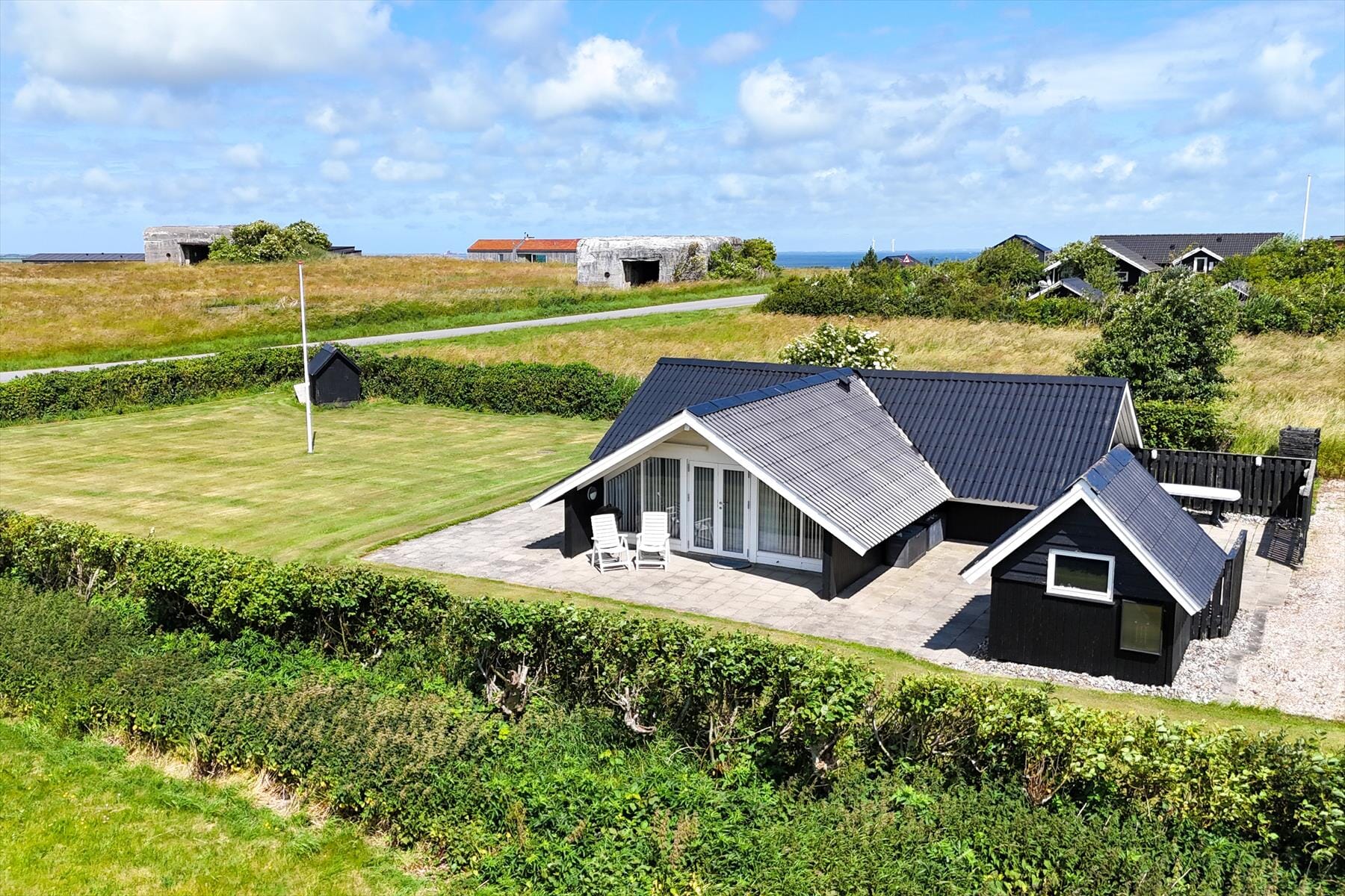 Udendørsarealerne ved sommerhuset er helt særlige – ikke mindst takket være den store, sydvendte fliseterrasse, der løber hele vejen rundt om huset. Her er der god plads til at finde netop det sol- eller skyggefulde hjørne, der passer til dit humør. Terrassen lægger op til lange morgenmåltider, legende børn og aftener med grill, snak og stjerner på himlen. Den store grund omkring huset giver masser af albuerum til spil og leg – eller til blot at læne sig tilbage og lade vinden suse i trætoppene. Her er det let at være til stede i nuet, og den rolige atmosfære på Bellisvej gør det nemt at slappe af og nyde ferien i fulde drag.