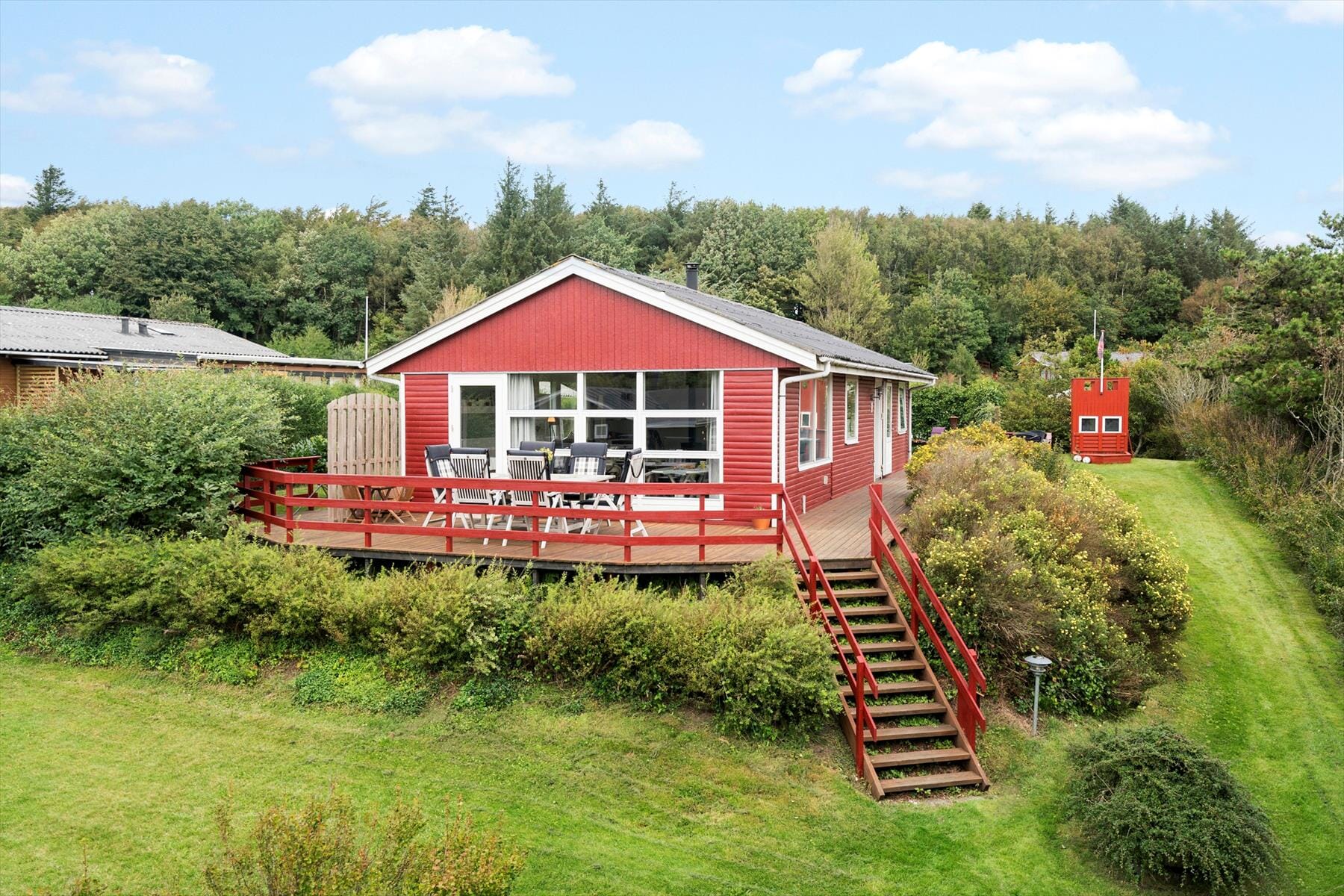Boligen er på 86 m² og ligger på en 705 m² stor eiendom, med blant annet sandkasse og lekehus.