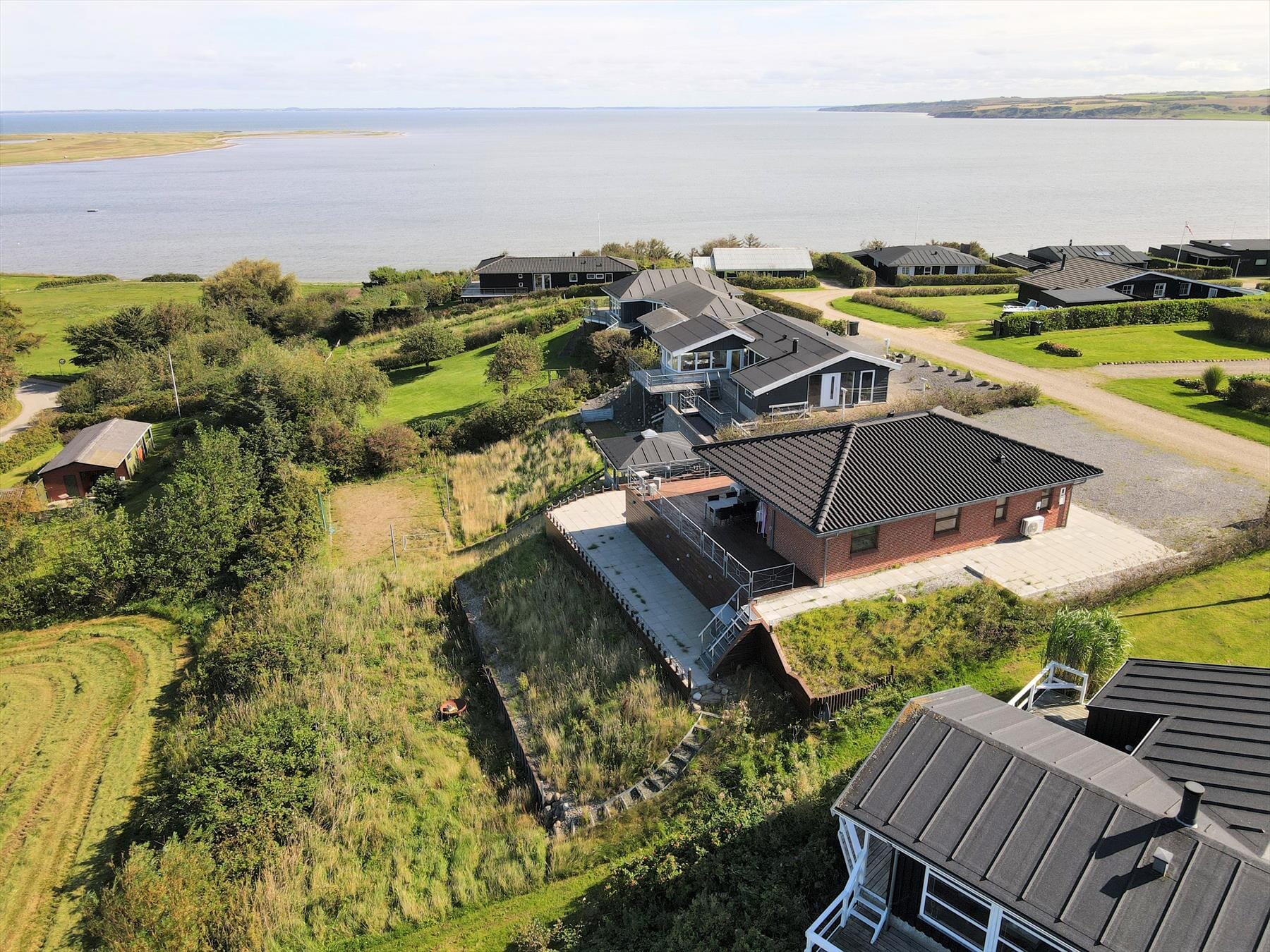 Haven omkring sommerhuset ligger på en let skrånende grund, som understreger det fine udsyn til landskabet og Limfjorden. Her kan du følge lyset og vinden hele dagen – måske fra en solseng på terrassen med en god bog, eller mens du forbereder aftensmaden på grillen og nyder lyden af børn og hund, der leger i græsset. Den store solterrasse inviterer til mange feriestunder under åben himmel – fra morgenmaden i det tidlige sollys til de lune aftener, hvor solen går ned over fjorden og maler himlen i pastelfarver. Omgivelserne er fredelige og ugenerede, så du kan slappe helt af, og der er masser af plads til både leg og ro i eget tempo. Det er med andre ord et oplagt sted at lade batterierne op – i samvær og stilhed, præcis som det passer jer.