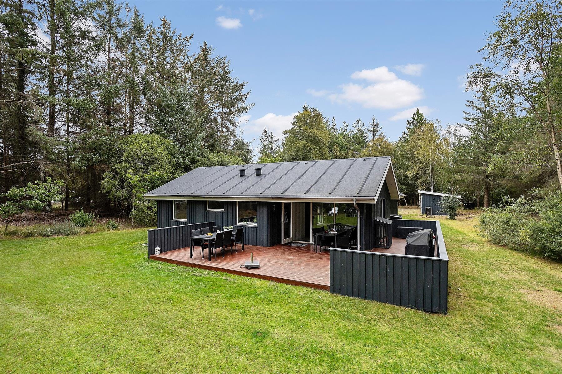 Boligen er på 115 m² og ligger på en 2 506 m² stor eiendom, med blant annet huske og sandkasse.