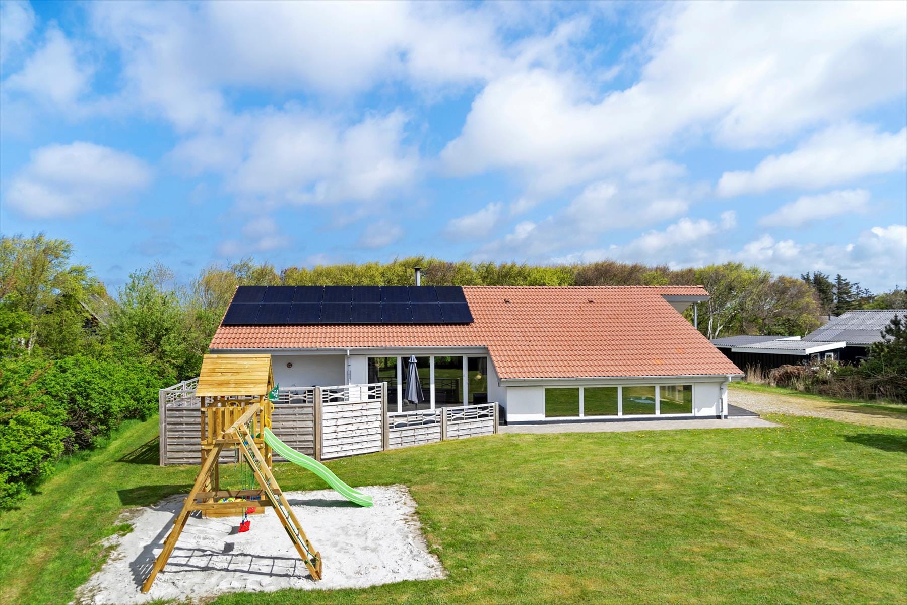 Boligen er på 187 m² og ligger på en 1 800 m² stor eiendom, med blant annet huske og sandkasse.