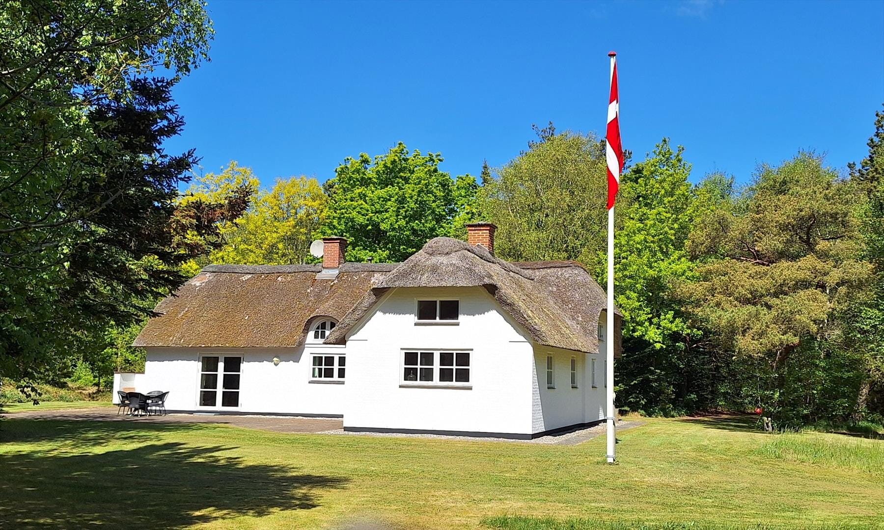 Boligen er på 120 m² og ligger på en 8 500 m² stor eiendom, med blant annet huske og sandkasse.