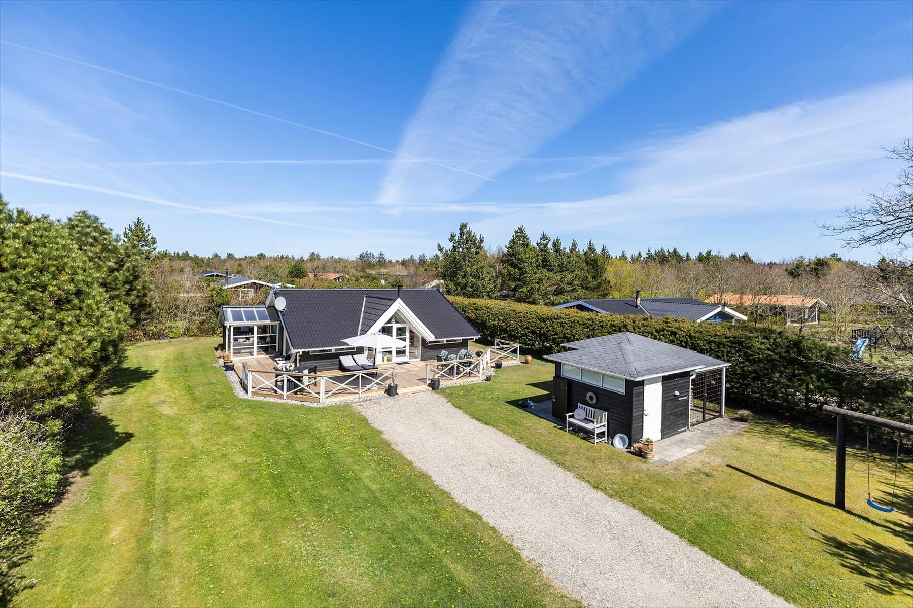 Boligen er på 79 m² og ligger på en 1 000 m² stor eiendom, med blant annet huske og sandkasse.