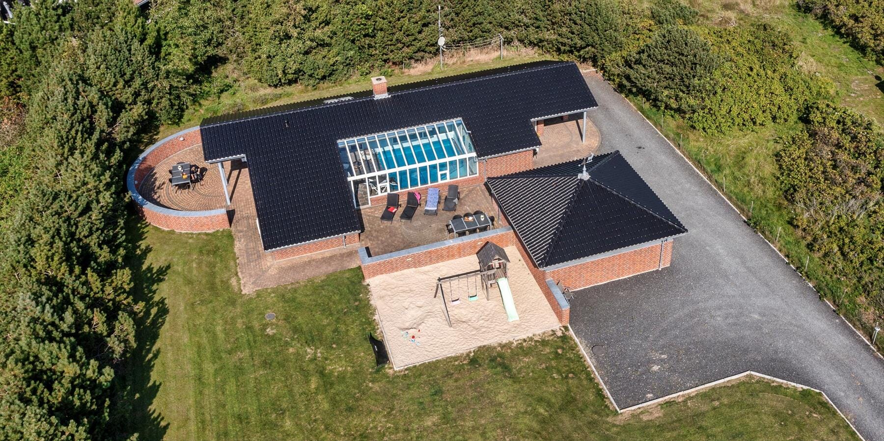 Boligen er på 187 m² og ligger på en 2 275 m² stor eiendom, med blant annet huske og sandkasse.