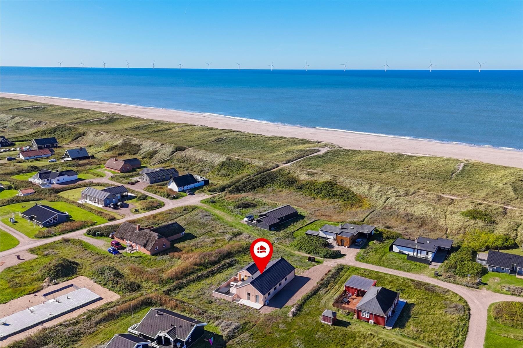 Sommerhusets moderne indretning skaber en lys og indbydende atmosfære, der straks får dig til at føle dig hjemme. Stue og køkken er elegant integreret og danner rammen om hyggelige stunder med familien eller vennerne. Forestil dig at samle hele selskabet til brætspil, madlavning eller en god film foran fjernsynet, mens solen skinner ind gennem de store vinduespartier. Sommerhusets soveværelser er ligeledes velindrettede, og med deres komfortable senge sikrer de en god nats søvn efter en dag fyldt med oplevelser. Badeværelset har et stilrent design og indbyder til afslapning – måske efter en tur langs stranden eller i de nærliggende klitter.