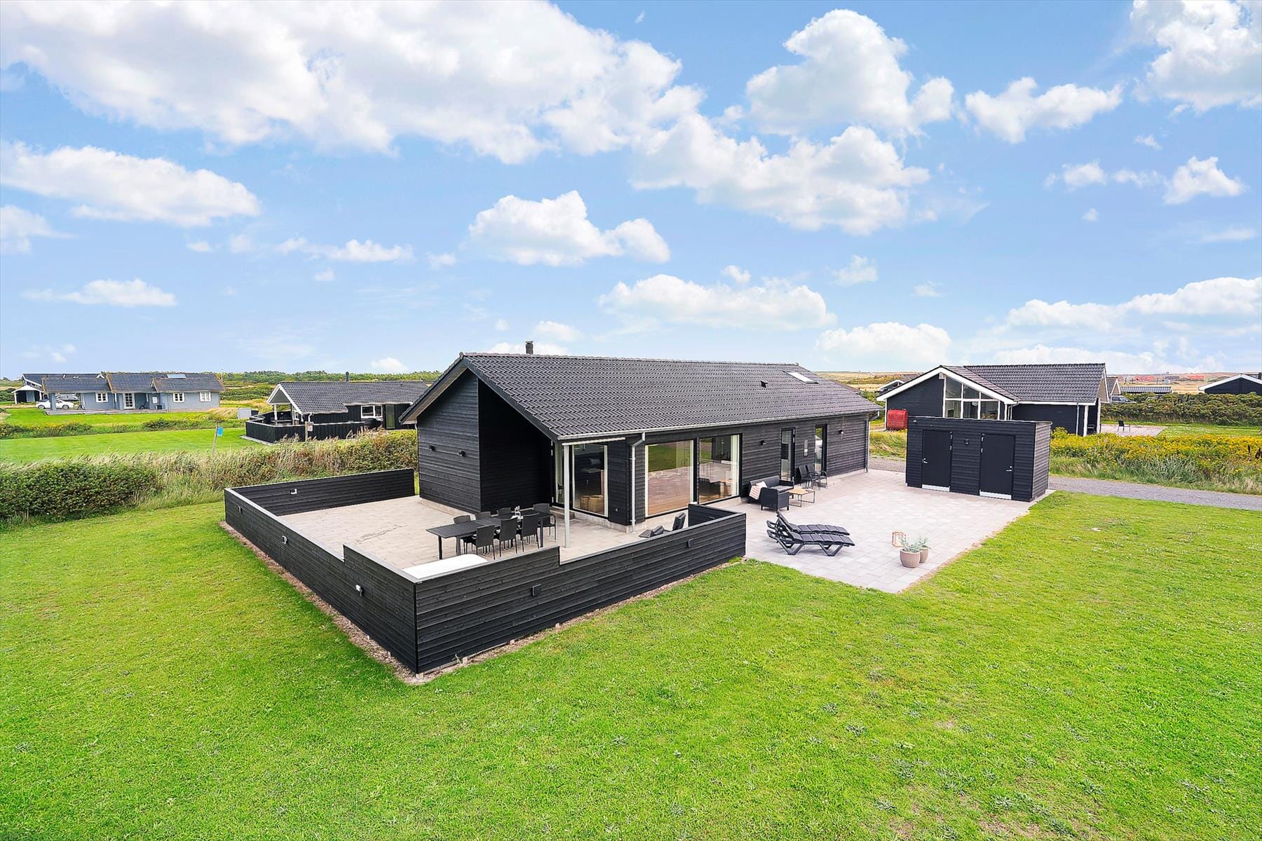 Det er let at finde sig til rette udenfor, for sommerhuset har en stor og delvist overdækket terrasse, der indbyder til ferie i det fri – uanset vejr og årstid. Et af uderummets absolutte højdepunkter er den udendørs jacuzzi, hvor du kan nyde et varmt bad under åben himmel, mens du lytter til havets brusen i det fjerne. Terrassen er stor nok til både afslapning i liggestolen, fælles måltider ved havebordet og leg med familiens yngste – og fordi grunden er velafskærmet, kan hunden også trygt være med. Her er der ro, privatliv og plads til bare at være – med solen i ansigtet og fuglefløjt i baggrunden.