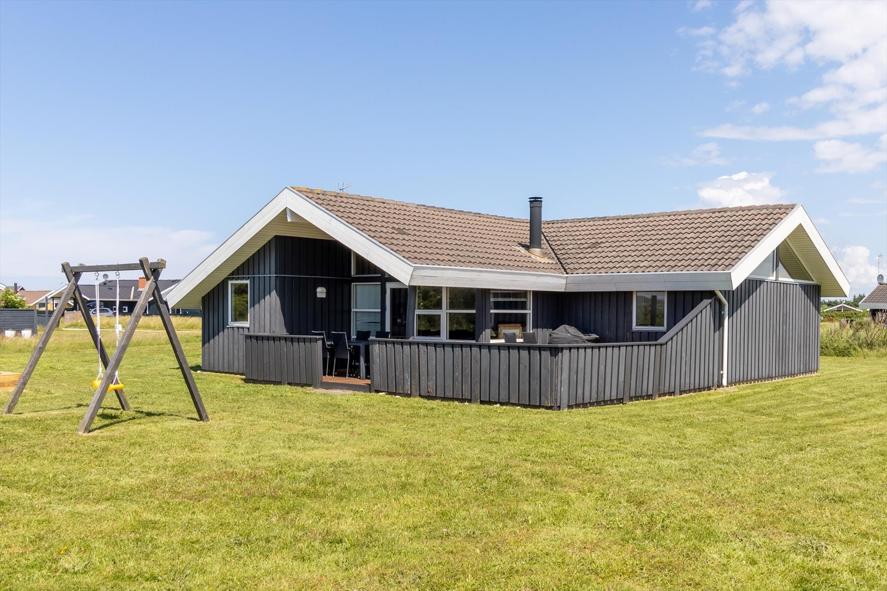Haven er noget særligt ved sommerhuset på Neerlandiavej 206. Med over 1.200 m² grund får du nemlig masser af plads til at nyde ferielivet i det fri. Her er god plads til at børnene kan slå sig løs – der er både gynge og sandkasse til de yngste – og de voksne kan samtidig nyde en stille stund i solen med udsigt til den grønne plæne. På den store terrasse er der både havemøbler og grill til rådighed, så du nemt kan skabe hyggelige rammer om dagens måltider eller en afslappende eftermiddag med kaffe og kortspil. Her er det oplagt at være sammen, men også let at finde et roligt hjørne til dig selv. Og når solen går ned, og luften bliver kølig, er det stadig muligt at blive ude længe – med tæpper, lanterner og lyden af aftenens fred.