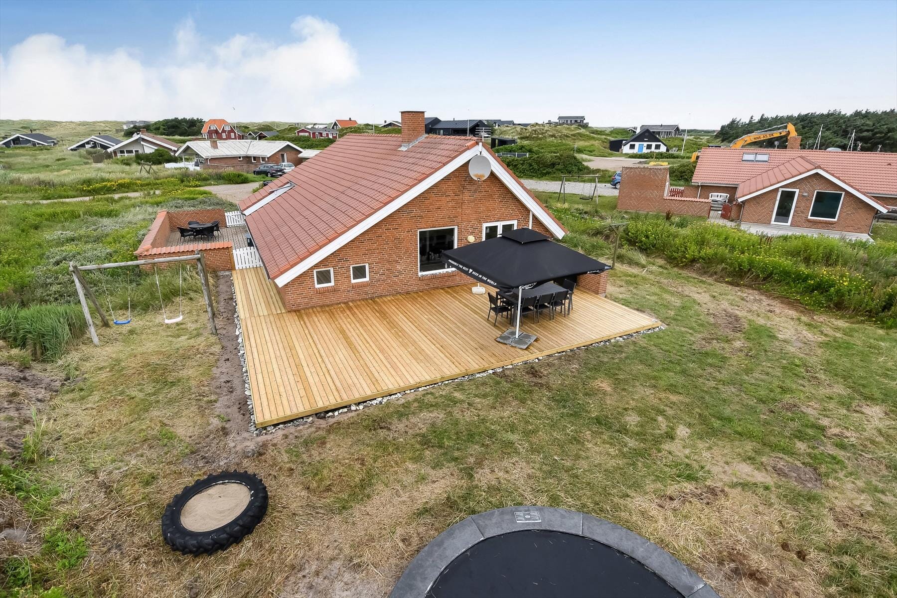 Udendørs finder du en stor naturgrund på 1.328 m² med to terrasser. Den ene terrasse er på 50 m² og helt lukket, hvilket gør den ideel for både børn og kæledyr. Her er der havemøbler, liggestole og en grill, så du kan nyde lange sommeraftener med lækre grillretter. Børnene kan more sig med gynge og sandkasse, mens du slapper af med en god bog eller blot nyder den friske havluft.