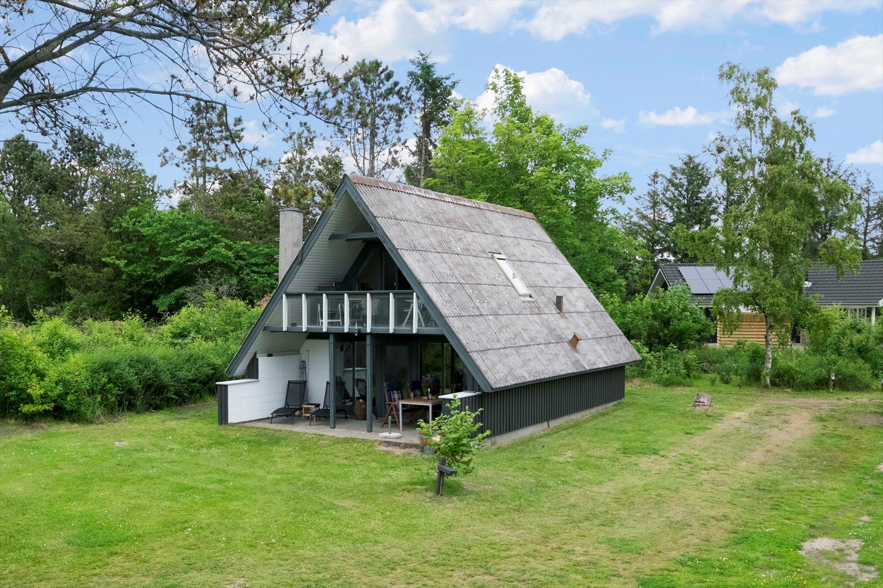 Boligen er på 95 m² og ligger på en 2 426 m² stor eiendom, med blant annet huske, sandkasse og lekehus.